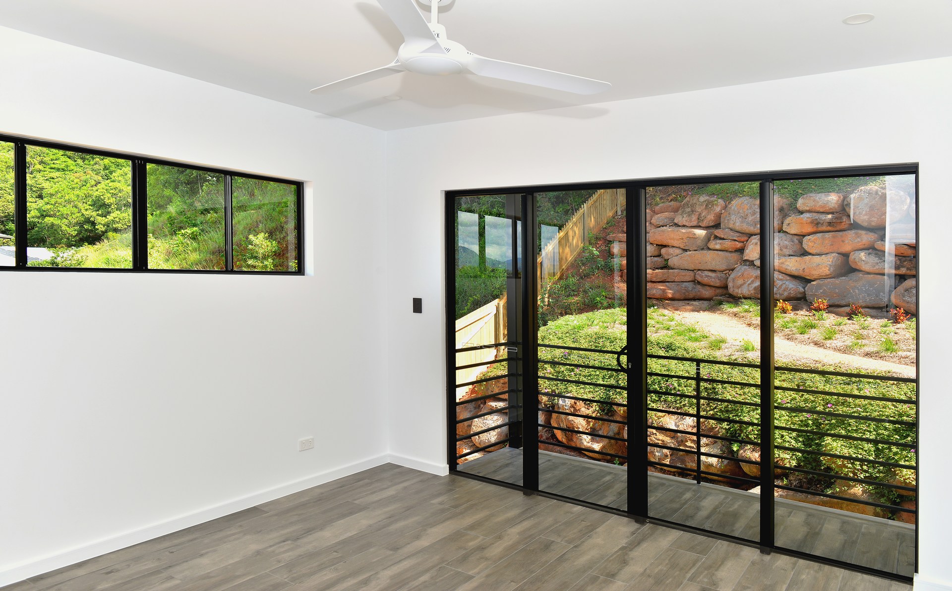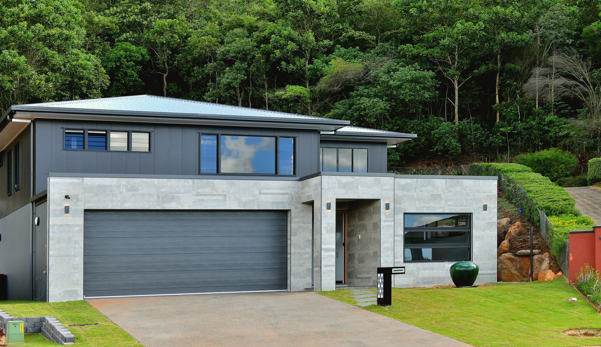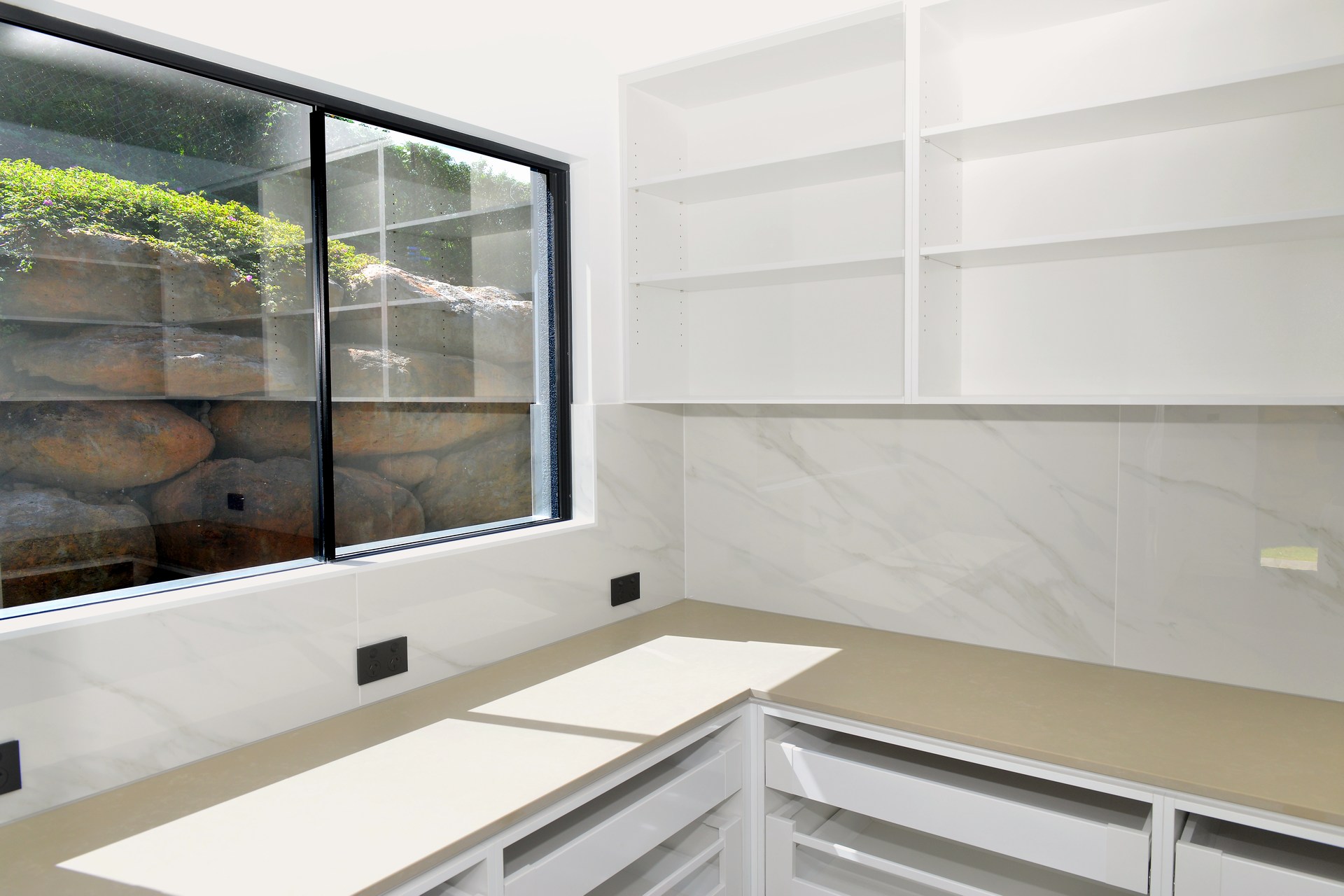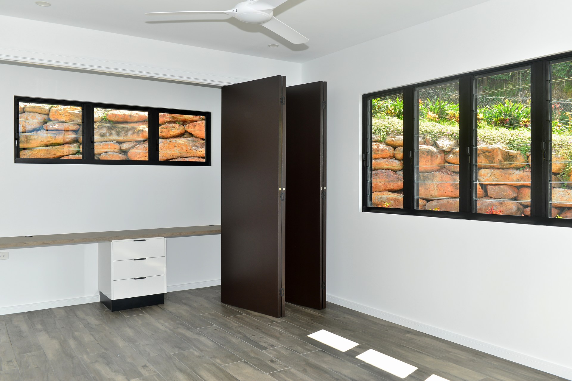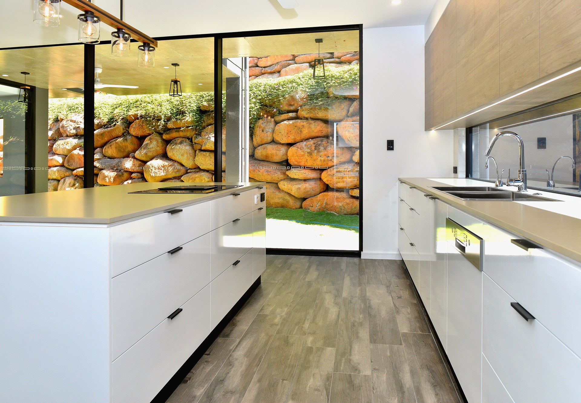 Split across two levels, the light filled open plan layout includes multiple living areas, a highly functional workspace, generous media room and lavish alfresco space which has been tied in with a remarkable rock retaining wall.