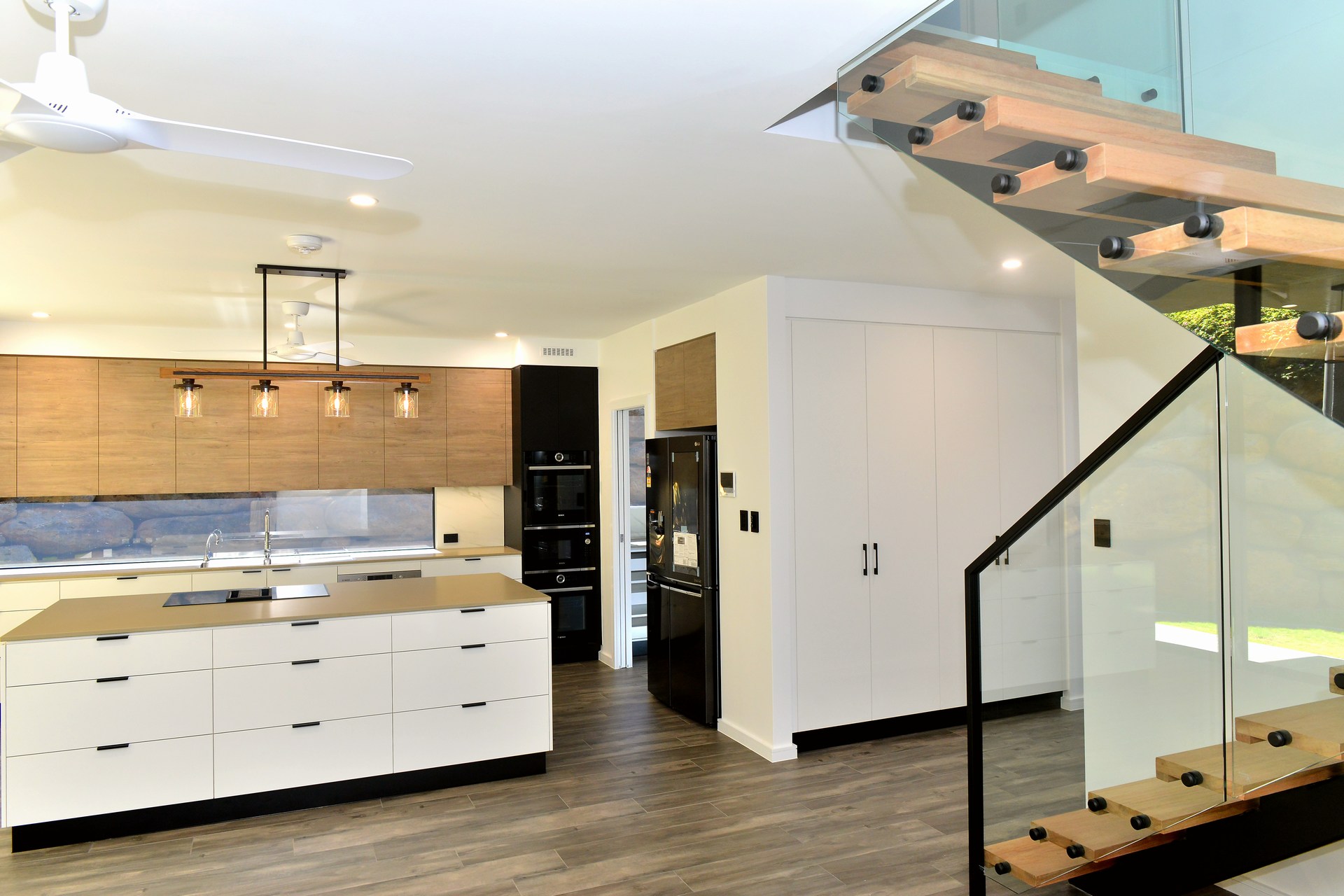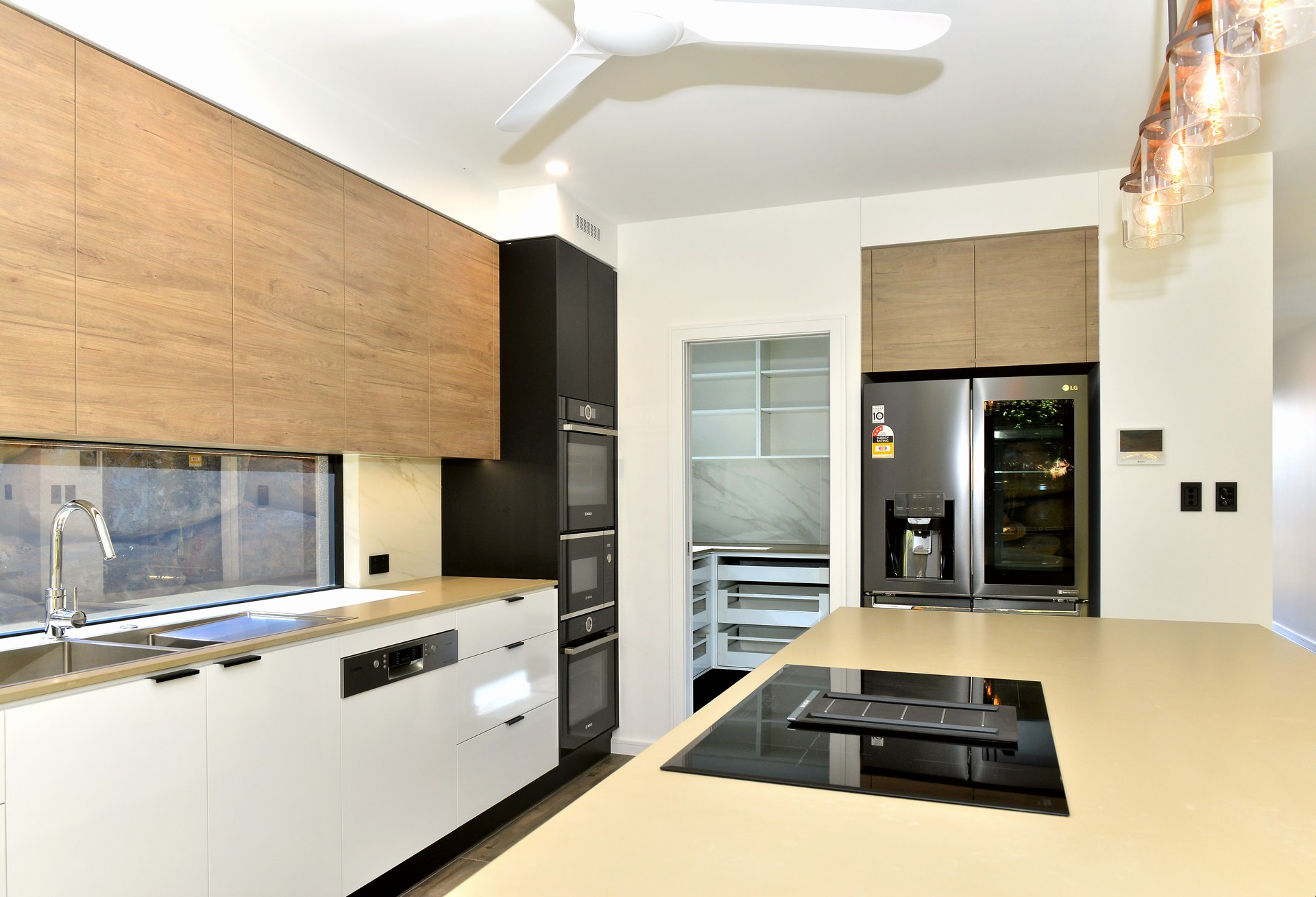 The luminous galley kitchen features a hidden butler’s pantry, a timeless glass splash back, state of the art appliances and beautiful feature lighting.